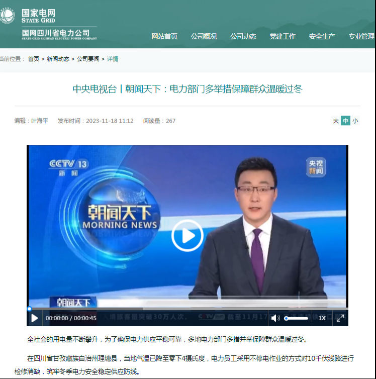 国网四川电力新闻发言人 罗晓伊:当前,国网四川电力已建成投运12项迎峰度冬重点电网工程,并正在有序推进69项500千伏和379项220千伏电网检修计划,及四川攀西电网优化改造工作,确保冬季电力供应稳定可靠。