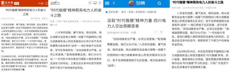 2024年8月29日,中共中央宣传部授予国网四川电力成都高新连心桥党员服务队“时代楷模”称号。四川省委、国家电网公司党组、国务院国资委党委相继作出向“时代楷模”学习的决定,引导广大党员干部从先进事迹中汲取精神力量。 一年来,形式多样、内容丰富的学习活动不断掀起热潮。国网四川电力特别制定“学习时代楷模 践行为民宗旨”党员示范带动十项行动,推出深化为民服务十项措施专项行动,把“时代楷模”精神转化为服务人民、推动发展的生动实践。 各级媒体高度关注,人民网、中国网、中国经济网、电网头条、中国发展网、改革网、国际在线、51网、四川新闻网、川经瞭望等媒体先后报道全川528支连心桥共产党员服务队、7000余名队员以“时代楷模”为榜样,将“有呼必应、有难必帮”的承诺融入日常工作的每一个细节,无论是迎峰度夏、世运会保电等重大任务一线,还是电网工程建设、日常供电服务现场,以实际行动在党和群众之间架起一座座“连心桥”,书写新时代暖心感人的为民篇章。 电网头条:以“时代楷模”为榜样 书写电力为民新篇章 2024年8月29日,中央宣传部授予国网四川电力成都高新连心桥党员服务队“时代楷模”称号。国务院国资委党委、四川省委、国家电网有限公司党组作出向“时代楷模”学习的决定,引导广大党员干部从先进事迹中汲取精神力量。 一年来,国网四川电力528支连心桥党员服务队7000余名队员以“时代楷模”为榜样,继续以实际行动在党和群众之间架起一座座“连心桥”。 8月20日,国网四川电力成都高新连心桥党员服务队队员在四川成都市倪家桥1号新源里充电站开展路侧充电桩车网互动(V2G)装表接电工作。(陈红梅) 国网四川电力特别制订“学习时代楷模 践行为民宗旨”党员示范带动十项行动方案,推出深化为民服务十项措施专项行动,把“时代楷模”精神转化为服务人民、推动发展的生动实践。 在“时代楷模”的旗帜引领和精神感召下,无论是迎峰度夏、世运会保电等重大任务一线,还是电网工程建设、日常供电服务现场,处处可见连心桥党员服务队队员勇担重任的身影。 坚守保电一线 在急难险重中彰显担当 荣誉,往往意味着更大的责任。 在成都世运会保电现场,面对庞杂的设备参数和运行方式,高新连心桥党员服务队队长吴昊说:“走一趟记不住,就走两趟、三趟……”6个点位的保电方案、10余条微网供电线路情况,被他刻进心里,为后续高效巡检打下坚实基础。 成都世运会开幕式当天,国网四川电力成都高新连心桥党员服务队队员巡视检查户外电力设备。(冯一哲) “保电有我,有我必胜”。成都世运会期间,高新连心桥党员服务队提前50多天进驻场馆,每日开展负荷溯源、隐患排查与应急演练工作。开幕式当天,队员们连续值守15个小时,实现了“保到灯头、保到话筒、保到插座”的精细保障。 “‘时代楷模’的先进事迹,一直激励着我们奋勇前行。”高温天气下,国网四川电力(天府新区)连心桥党员服务队队员蔡勇坚守在兴隆湖湖滨场馆一线。他表示,要向高新连心桥党员服务队学习,在急难险重任务中挑大梁、担重任,在大战大考中冲锋在第一线、奋战在最前沿。 国网四川电力(天府新区)连心桥党员服务队队员巡视检查开幕式场地设备。(陈翔) 作为成都世运会运行最复杂的场馆,兴隆湖湖滨场馆需应对多项目快速切换、水陆赛事交替的挑战。自入驻以来,蔡勇与队员们推行“党员责任区+包干制”,每日监测54处重要负荷设备,详细记录电流电压数据,把电力保障延伸到“最后一厘米”,让“每片区域有党员带头、每个岗位有责任闭环”。 今年夏天,四川遭遇三轮高温天气,热浪与暴雨交替袭来,电网最大用电负荷四次创下新高。在雅安,11支连心桥党员服务队顶烈日、战高温,立下“异常不排除,我们不撤离”的誓言。在绵阳,20支连心桥党员服务队顶着40摄氏度的高温排查隐患,衣服上的汗渍是最耀眼的勋章。在德阳,30支连心桥党员服务队373名队员日夜奋战,“赶紧干,老百姓用电耽搁不得!”——朴素的话语背后,是沉甸甸的担当。 国网四川电力(绵阳)连心桥党员服务队队员在绵阳市涪城区绵兴社区和绵州社区帮助老人更换灯具,排除安全隐患。(田海) 攻坚电网建设 在重大工程中树立标杆 8月26日,海拔3600多米的阿坝1000千伏变电站场平施工现场薄雾朦胧。国网四川送变电公司项目常务副经理、临时党支部书记张晓洪手持安全巡检记录本,开始了他的“晨巡必修课”。 阿坝1000千伏变电站新建工程场平施工现场正在进行填方边坡区土工格栅铺设及回填作业。(牛丁祺) “向高新连心桥党员服务队学习,就是要扎根基层、敬业奉献,在平凡岗位上努力做出不平凡业绩。”今年45岁的张晓洪是一名拥有21年党龄的老党员。他带领项目部70余名员工成功攻克高海拔混凝土浇筑、冻土区基础施工等技术难题,啃下了一个又一个“硬骨头”。 张晓洪深知,在高海拔地区建工程,安全是底线更是生命线。他以“不放过一个隐患、不忽视一个细节”的态度严抓工程质量。截至目前,党员带头排查整改风险点35处,筑起了一道坚实的“红色安全屏障”。 同一天,在阿坝—成都东1000千伏特高压交流工程的铁塔组立现场,国网四川建设公司党员突击队队员王伟通过天网监控系统,远程实时监护高空作业人员完成一整