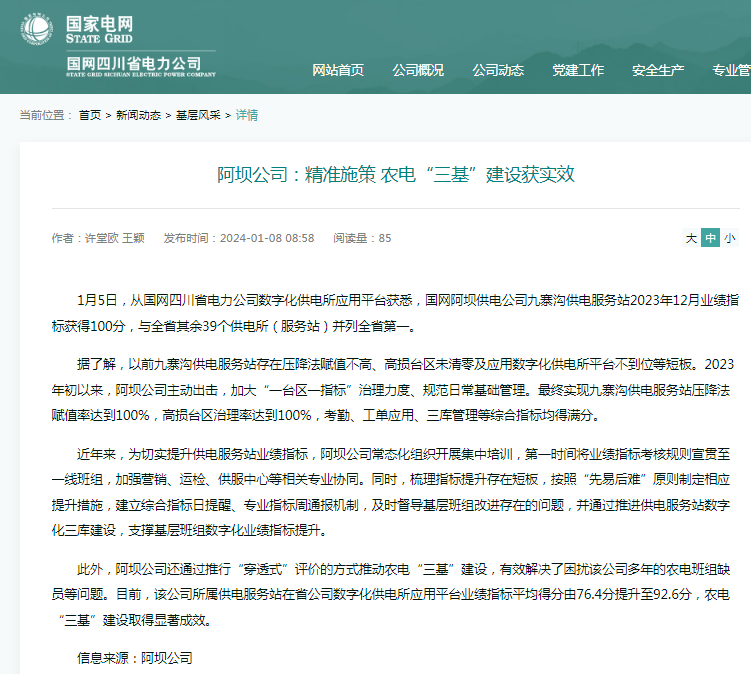 1月5日,从国网四川省电力公司数字化供电所应用平台获悉,国网阿坝供电公司九寨沟供电服务站2023年12月业绩指标获得100分,与全省其余39个供电所(服务站)并列全省第一。 据了解,以前九寨沟供电服务站存在压降法赋值不高、高损台区未清零及应用数字化供电所平台不到位等短板。2023年初以来,阿坝公司主动出击,加大“一台区一指标”治理力度、规范日常基础管理。最终实现九寨沟供电服务站压降法赋值率达到100%,高损台区治理率达到100%,考勤、工单应用、三库管理等综合指标均得满分。 近年来,为切实提升供电服务站业绩指标,阿坝公司常态化组织开展集中培训,第一时间将业绩指标考核规则宣贯至一线班组,加强营销、运检、供服中心等相关专业协同。同时,梳理指标提升存在短板,按照“先易后难”原则制定相应提升措施,建立综合指标日提醒、专业指标周通报机制,及时督导基层班组改进存在的问题,并通过推进供电服务站数字化三库建设,支撑基层班组数字化业绩指标提升。 此外,阿坝公司还通过推行“穿透式”评价的方式推动农电“三基”建设,有效解决了困扰该公司多年的农电班组缺员等问题。目前,该公司所属供电服务站在省公司数字化供电所应用平台业绩指标平均得分由76.4分提升至92.6分,农电“三基”建设取得显著成效。 (未经允许 禁止转载)