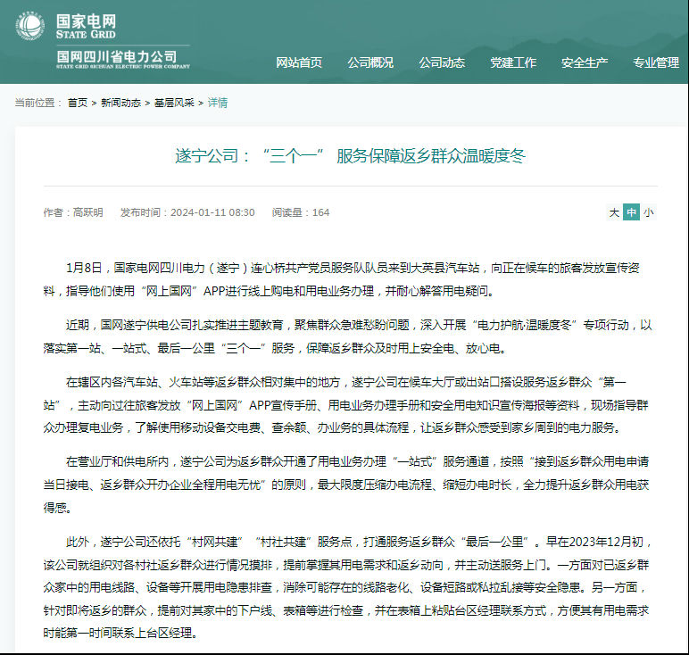 1月8日,国家电网四川电力(遂宁)连心桥共产党员服务队队员来到大英县汽车站,向正在候车的旅客发放宣传资料,指导他们使用“网上国网”APP进行线上购电和用电业务办理,并耐心解答用电疑问。 近期,国网遂宁供电公司扎实推进主题教育,聚焦群众急难愁盼问题,深入开展“电力护航·温暖度冬”专项行动,以落实第一站、一站式、最后一公里“三个一”服务,保障返乡群众及时用上安全电、放心电。 在辖区内各汽车站、火车站等返乡群众相对集中的地方,遂宁公司在候车大厅或出站口搭设服务返乡群众“第一站”,主动向过往旅客发放“网上国网”APP宣传手册、用电业务办理手册和安全用电知识宣传海报等资料,现场指导群众办理复电业务,了解使用移动设备交电费、查余额、办业务的具体流程,让返乡群众感受到家乡周到的电力服务。 在营业厅和供电所内,遂宁公司为返乡群众开通了用电业务办理“一站式”服务通道,按照“接到返乡群众用电申请当日接电、返乡群众开办企业全程用电无忧”的原则,最大限度压缩办电流程、缩短办电时长,全力提升返乡群众用电获得感。 此外,遂宁公司还依托“村网共建”“村社共建”服务点,打通服务返乡群众“最后一公里”。早在2023年12月初,该公司就组织对各村社返乡群众进行情况摸排,提前掌握其用电需求和返乡动向,并主动送服务上门。一方面对已返乡群众家中的用电线路、设备等开展用电隐患排查,消除可能存在的线路老化、设备短路或私拉乱接等安全隐患。另一方面,针对即将返乡的群众,提前对其家中的下户线、表箱等进行检查,并在表箱上粘贴台区经理联系方式,方便其有用电需求时能第一时间联系上台区经理。 截至目前,遂宁公司已开展台区变压器、输电线路和群众家庭用电设备安全隐患排查236次,消除各类隐患78项,发放宣传资料2000余份。 (未经允许 禁止转载)