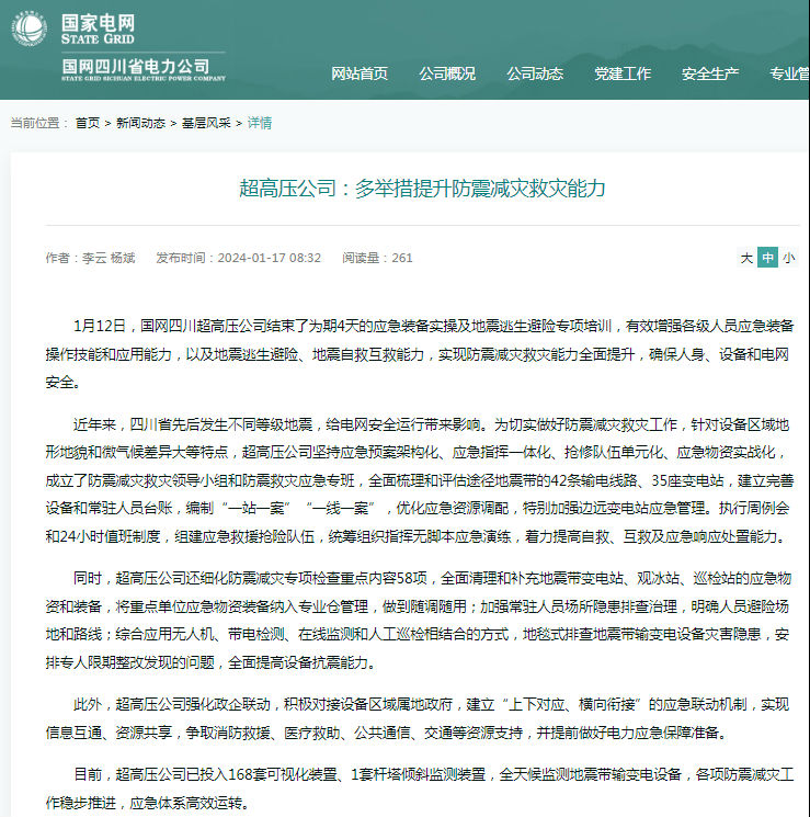 1月12日,国网四川超高压公司结束了为期4天的应急装备实操及地震逃生避险专项培训,有效增强各级人员应急装备操作技能和应用能力,以及地震逃生避险、地震自救互救能力,实现防震减灾救灾能力全面提升,确保人身、设备和电网安全。 近年来,四川省先后发生不同等级地震,给电网安全运行带来影响。为切实做好防震减灾救灾工作,针对设备区域地形地貌和微气候差异大等特点,超高压公司坚持应急预案架构化、应急指挥一体化、抢修队伍单元化、应急物资实战化,成立了防震减灾救灾领导小组和防震救灾应急专班,全面梳理和评估途径地震带的42条输电线路、35座变电站,建立完善设备和常驻人员台账,编制“一站一案”“一线一案”,优化应急资源调配,特别加强边远变电站应急管理。执行周例会和24小时值班制度,组建应急救援抢险队伍,统筹组织指挥无脚本应急演练,着力提高自救、互救及应急响应处置能力。 同时,超高压公司还细化防震减灾专项检查重点内容58项,全面清理和补充地震带变电站、观冰站、巡检站的应急物资和装备,将重点单位应急物资装备纳入专业仓管理,做到随调随用;加强常驻人员场所隐患排查治理,明确人员避险场地和路线;综合应用无人机、带电检测、在线监测和人工巡检相结合的方式,地毯式排查地震带输变电设备灾害隐患,安排专人限期整改发现的问题,全面提高设备抗震能力。 此外,超高压公司强化政企联动,积极对接设备区域属地政府,建立“上下对应、横向衔接”的应急联动机制,实现信息互通、资源共享,争取消防救援、医疗救助、公共通信、交通等资源支持,并提前做好电力应急保障准备。 目前,超高压公司已投入168套可视化装置、1套杆塔倾斜监测装置,全天候监测地震带输变电设备,各项防震减灾工作稳步推进,应急体系高效运转。 (未经允许 禁止转载)