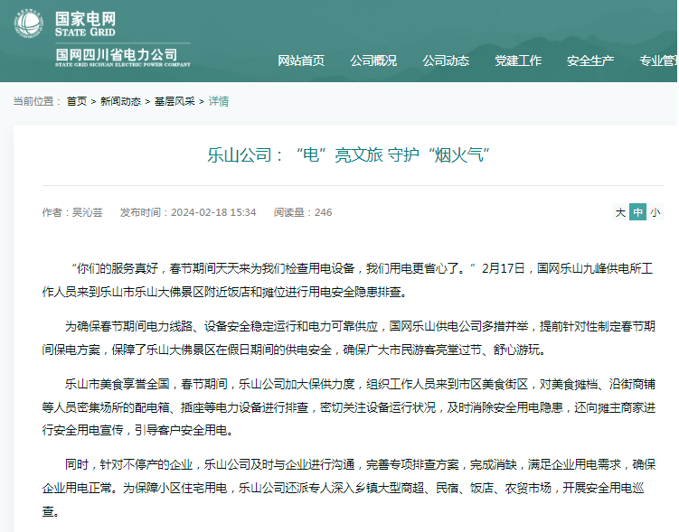 “你们的服务真好,春节期间天天来为我们检查用电设备,我们用电更省心了。”2月17日,国网乐山九峰供电所工作人员来到乐山市乐山大佛景区附近饭店和摊位进行用电安全隐患排查。 为确保春节期间电力线路、设备安全稳定运行和电力可靠供应,国网乐山供电公司多措并举,提前针对性制定春节期间保电方案,保障了乐山大佛景区在假日期间的供电安全,确保广大市民游客亮堂过节、舒心游玩。 乐山市美食享誉全国,春节期间,乐山公司加大保供力度,组织工作人员来到市区美食街区,对美食摊档、沿街商铺等人员密集场所的配电箱、插座等电力设备进行排查,密切关注设备运行状况,及时消除安全用电隐患,还向摊主商家进行安全用电宣传,引导客户安全用电。 同时,针对不停产的企业,乐山公司及时与企业进行沟通,完善专项排查方案,完成消缺,满足企业用电需求,确保企业用电正常。为保障小区住宅用电,乐山公司还派专人深入乡镇大型商超、民宿、饭店、农贸市场,开展安全用电巡查。 据统计,春节期间,乐山公司共有598名保电员工在岗开展24小时值守工作,6台应急发电车、58台应急发电机处于待命状态,随时应对突发情况,保障了市民和游客度过一个温暖祥和亮堂的新春佳节。 (未经允许 禁止转载)