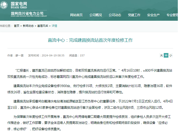 “汇报值长,建苏直流已由姑苏站解锁成功,目前双极直流系统均运行正常。”4月16日10时,±800千伏建昌换流站双极直流系统一次性充电成功,标志着国网四川直流中心完成建昌换流站投运以来首次年度检修工作。 建昌换流站本次作业完成设备检修3900台、例行检修35项、大修技改2项、主要消缺计划31项、隐患治理36项,软件修改26项,旨在全面检查设备状态,消除潜在隐患,提升换流站的运行效率和可靠性。 建昌换流站承担着将白鹤滩水电站清洁能源输送至江苏负荷中心的重要任务,于2022年7月1日正式投入运行。4月4日至15日,直流中心联合43家参检单位对建昌换流站进行首次全面检修,涉及二级作业风险9项、三项作业风险12项。 为保障首次年度检修工作开展有序,直流中心利用停电窗口期最大限度提升检修质效,组织参检人员多次召开大修工作推进会,做好工作部署,要求全体运维人员提高政治站位,明确自身任务和检修期间各阶段安排,确保设备“应修必修,修必修好”,把好设备检修质量关。 年度检修期间,直流中心积极沟通接洽参检单位,定期召开碰头会、协调会,细化任务分工,压实工作责任。同时,针对性强化交叉作业、高空作业等危险点预控,确保作业全流程安全可控。成立检修作业现场指挥部,设立多个现场工作组,明确时间节点,优化管控措施。此外,还通过举行主题活动暨共产党员服务队授旗仪式设置党(团)员责任区和示范岗,充分发挥党员先锋模范和青年生力军作用,为年检工作提供有力保障。 针对本次年检综合保障工作,直流中心高度重视、精心筹备,确保所需项目物资在年检前全部到货,现场到货物资责任到人,验收人员严格把控物资质量,为年检的顺利进行提供了物资保障。同时,牢固树立“服务生产、服务大局”意识,以更完善的机制、更充分的准备、更全面的保障,用心用情为年检现场提供暖心为民服务,确保综合保障有力到位,助力年度检修工作高质量开展。 (未经允许 禁止转载)