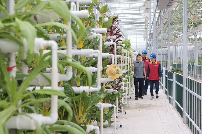 安徽省怀远县的蚌埠国家农业科技园区内集中了应用玻璃温室大棚、无土栽培、生态养殖等新技术、新模式的16家高科技农业企业,园区全部采用智能化温室监控、自动化流水线生产、物联网产销模式等现代设施农业种植技术,是怀远县现代化农业一张闪亮的名片。图为国网蚌埠供电公司员工对种植温室的配电柜等电力设备进行巡检,并就用电情况进行调研。